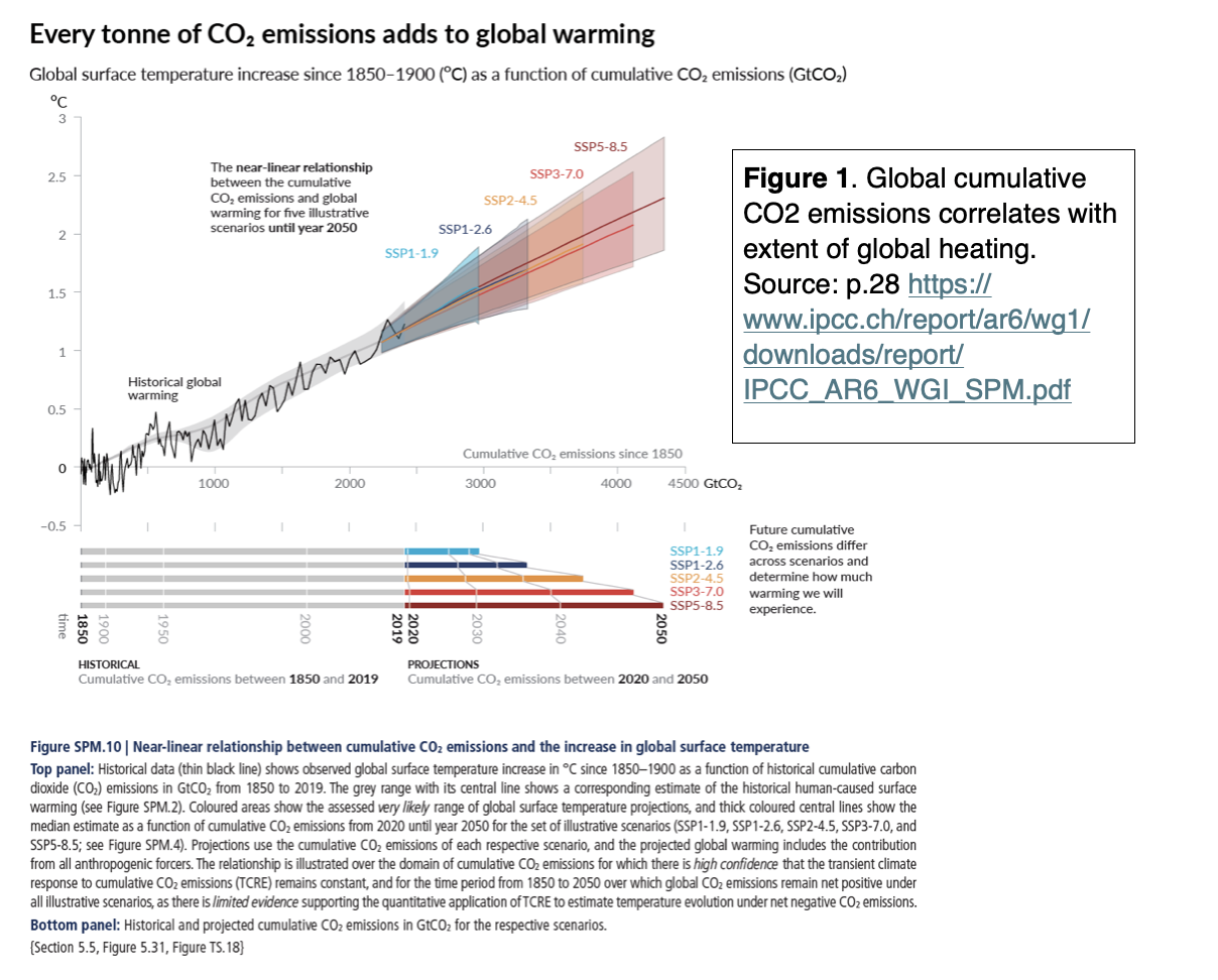 When we refer to our annual emissions in reports on climate change, it sends an unstated message that this is the most important indicator of our performance – and if annual emissions are declining towards ‘net’ zero by 2050, that is sufficient action. It’s not. As I pointed out to some young students recently, much of the emissions we release today will still be heating the planet when they are grown up and have kids of their own. This reality is illustrated by Figure 10 from the IPCC AR6 WG1 shown below as Figure 1.