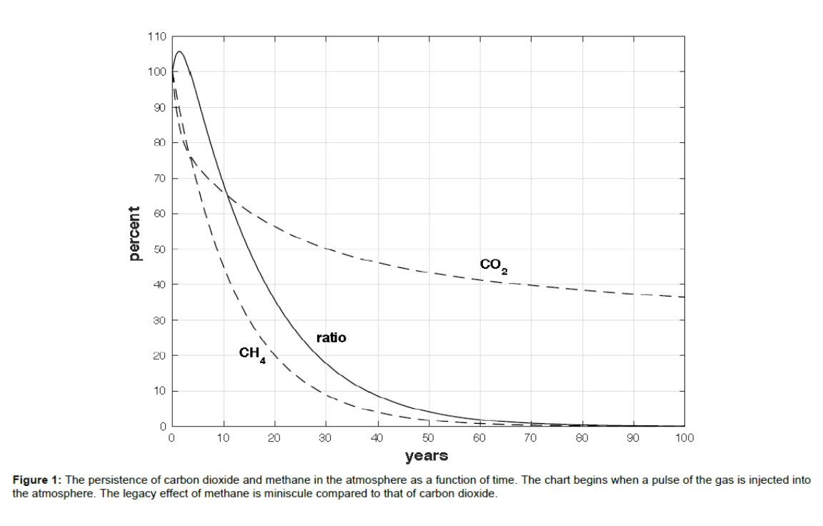 Figure 5. Real time emissions of major greenhouse gases over time. Conventional carbon accounting focuses on 100-year Global Warming Potentials, but impacts in early years are above the 100 year average. Actual impacts in early years after emission are much higher, so the sooner we cut emissions the lower the cumulative climate impact over the next few decades.