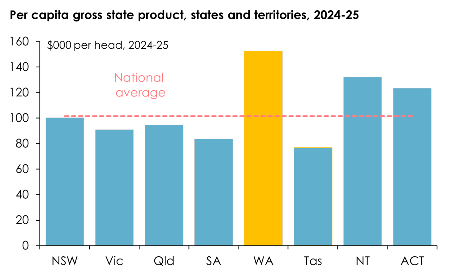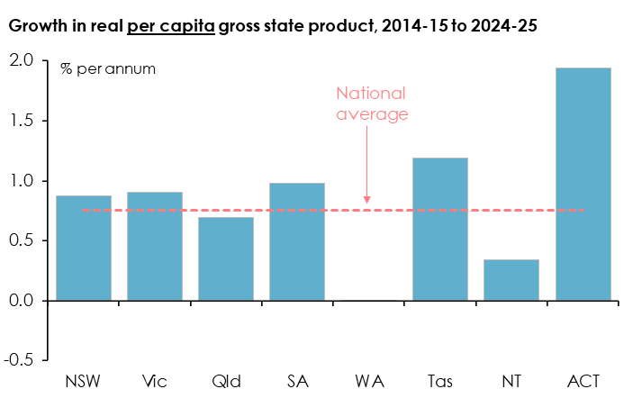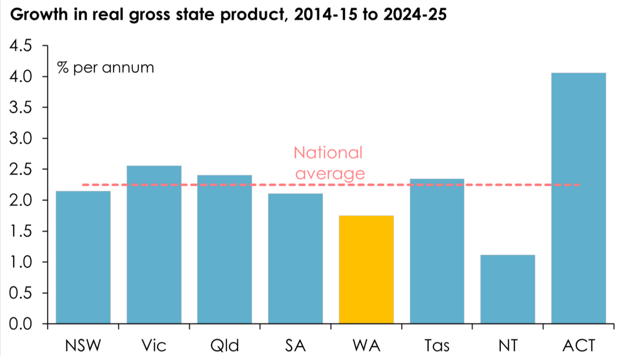 WA’s real per capita GSP has declined in each of the past two years (by 2.2 per cent and 1.1 per cent in 2023-24 and 2024-25, respectively), and in four of the past 10 years – a track record exceeded only by the Northern Territory.