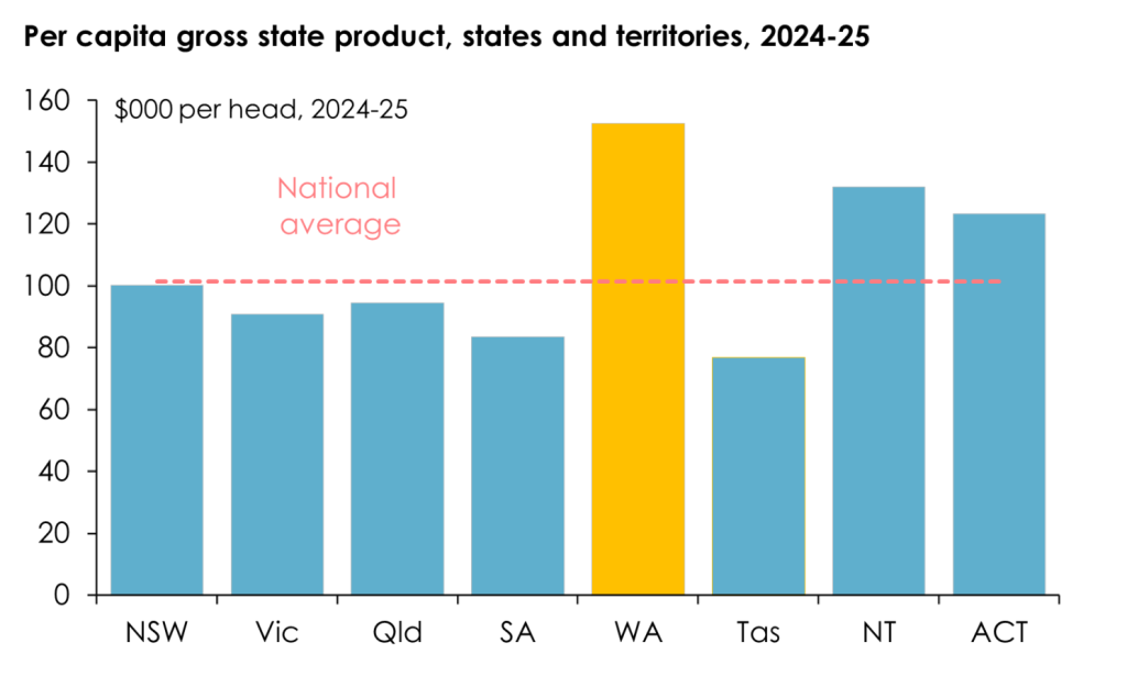 And lest any reader thinks I’m cherry-picking the 10 years to 2024-25 in order to cast WA’s economic performance in an unfavourable light, the same comparison holds if I pick, for example, the past five years rather than the past 10. Over the five years to 2024-25, WA’s real Gross State Product (GSP) grew at an average annual rate of 2.46 per cent: less than the national average of 2.51 per cent (albeit by a smaller margin than over the ten years to 2024-25), and less than the “mendicants” of Victoria (2.48 per cent) and Tasmania (2.61 per cent).