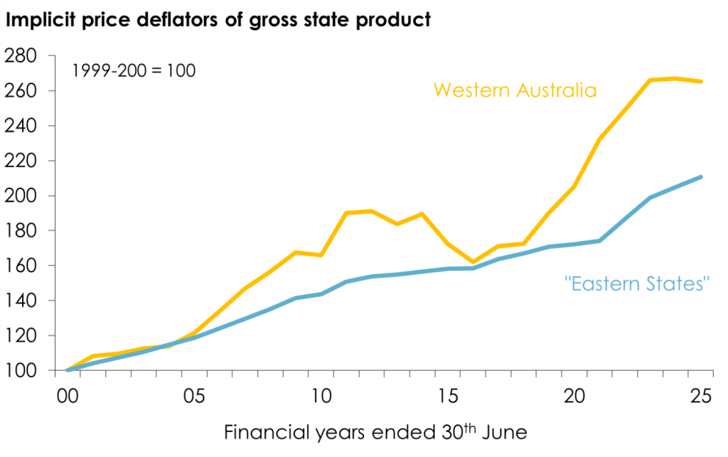 They show that, over the ten years to 2024-25, Western Australia’s real gross state product grew at an average annual rate of 1.7 per cent – the second-slowest of any state or territory (after the Northern Territory). Less than the national average of 2.2 per cent, and less than the states which Western Australians rejoice in depicting as ‘mendicant’, ie Victoria with 2.6 per cent per annum and Tasmania with 2.3 per cent per annum.