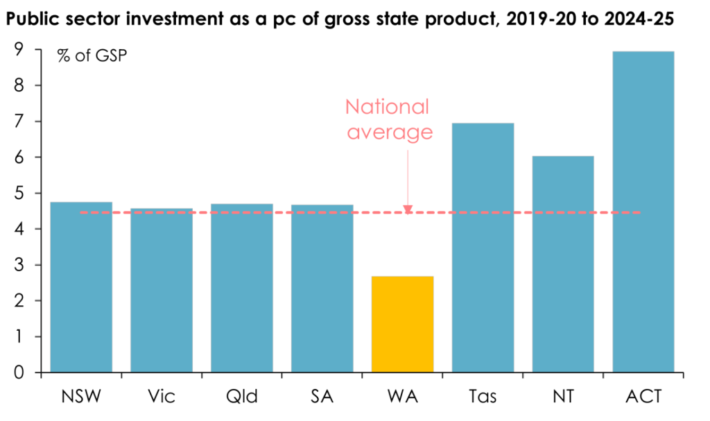 The State Accounts show that public sector investment (including, the WA Treasurer Rita Saffioti should note since earlier this month she falsely accused me of not including it, investment by WA’s larger-than-average public enterprise sector) represents a smaller share of WA’s economy than that of any other state or territory: