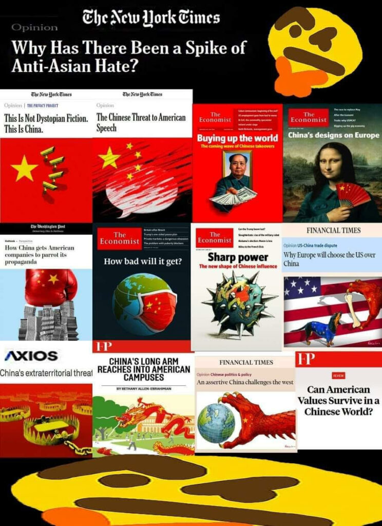 A collage of panic-inducing anti-China headlines from the New York Times and other major publications can be seen as a factor in the rise of anti-Asian hate seen in western countries.